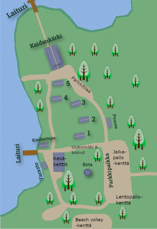 Aluekartasta näet Kaitaniemen mökit ja muut rakennukset ja tärkeimmät kohteet. Leirikeskuksen pinta-ala on noin kolme hehtaaria!